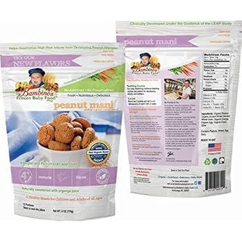 THE ONLY COOKIE DEVELOPED TO DESENSITIZE AGAINST PEANUT ALLERGY. In February 2015 the New England Journal of Medicine published the first article on how to prevent high risk infants from the dreaded peanut allergy called the LEAP study. Founder and CEO Zoi Maroudas together with the support of allergist developed a recipe specifically designed to help prevent infants from developing the peanut allergy naturally. The Peanut Mani cookie has the exact amount of natural peanut protein, give daily will help desensitize infants from ever developing the peanut allergy with a success rate of 85%. In 2015 and 2016 our Founder presented the Peanut Mani cookie/cereal to the American Allergy Foundation conference. With an overwhelming response amongst allergist and pediatricians the Peanut Mani can now be found in many allergists office around the nation. THE COOKIE IS SPECIFICALLY DESIGNED FOR LITTLE ONES AS EARLY AS FOUR MONTHS. HOW DO I USE IT? For infants 4-8 months, crush cookie and mix into breast milk or formula for cereal like texture. Your bambino may be ready to snack on their own when: Grasps when cookie is presented Can sit upright and hold up head Has mastered tongue movement The flavor is absolutely delightful and full of the natural nutrients excellent as a nutritious snack. WHAT IS IN IT? This cookie contains organic peanuts, organic ancient winter harvest wheat, organic oranges, organic eggs and organic ghee. WHERE IS THIS MADE? This 100% organic meal is handcrafted by a small, mother-owned company in Alaska. Our veggies are grown on a family farm with nutrient-rich glacier water in the untainted soils of Palmer, Alaska and we make our own ghee (clarified butter) from fresh organic milk. WHAT IS INCLUDED? Each package contains 12 cookies. WHO IS THIS FOR? Peanut Mani Cookies are nutritionist- and allergist-approved for bambinos 4 months and up. Reseal package to keep fresh. Store at room temperature.