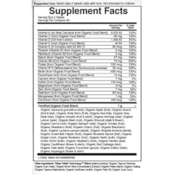 Certified Vegan, Gluten Free and NO Syntheitc Binders or Fillers. Contains 16 Vitamins & Minerals with Greater than 100% Daily Value. A Full Complement of Nutrients from Organic, Non-GMO Whole Foods. Targeted Levels of Folate (from Organic Lemon) for Prostate Health and Targeted Levels of Chromium (from Organic Moringa) for Healthy Metabolism. Contains 500 Percent Daily Value of Vitamin B-12 (Methylcobalamin) for Extra Energy.