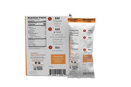 🍠 Sweet Potato Baby ( and everyone else food) the perfect first food and healthy snack for anyone! 💲Save by buying more. 💧 Each packet re-hydrates to approximate 2.5 oz or more depending on the amount of liquid used and thickness you like.🍠There is about 2/3 of a whole a fresh perfectly ripe sweet potato in each packet.! 💚 This is perfect for babies or for quick side dishes and more. Organic, Non GMO, No additives, No fillers just goodness! ✳ Mix with breast milk or formula for baby ✳ Easy for recipes ✳ Throw it in your bag with some water and one of our collapsible bowls or pouches or mix it right up in the pack for the perfect healthy snack! ** Because there are no additives this product will brown like a normal banana as it sits out but still tastes just as yummy **