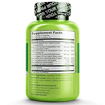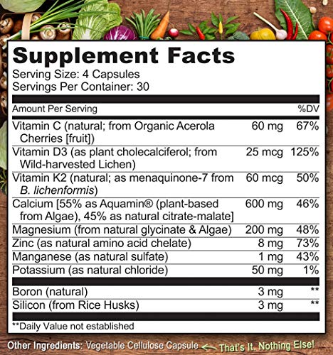 NATURELO Bone Strength – Plant-Based Calcium, Magnesium, Potassium, Vitamin D3, VIT C, K2 – GMO, Soy, Gluten Free Ingredients – Best Whole Food Supplement for Bone Health – 120 Vegetarian Capsules