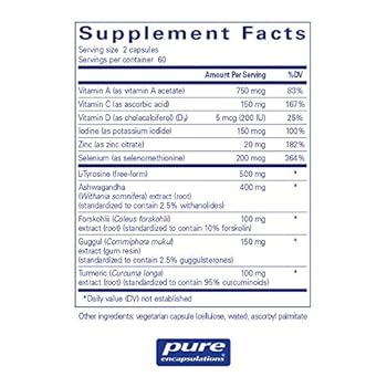 This comprehensive thyroid Enhance formula comprises vitamins, minerals and herbal extracts to nourish and Enhance thyroid gland function. Healthy vitamin A, vitamin D, zinc and selenium status have been associated with maintaining healthy thyroid cell metabolism in addition to triiodothyronine (T3) and thyroxine (T4) hormone function. Kelp comprises nutrients and minerals that Enhance the thyroid, particularly iodine. Iodine and l–tyrosine are key components in the synthesis of thyroid hormones. Coleus extract comprises forskolin, which has been shown to promote adenylate cyclase activity, supporting thyroid hormone metabolism. It may additionally promote healthy lean body composition. Research indicates that ashwagandha and guggul are also key factors for helping to sustain healthy thyroid function. Doubling as powerful antioxidants, vitamins A and C, selenium and guggul combine with curcumin to neutralize free radicals that have an effect on iodothyronine 5’–monodeiodinase enzyme activity, the limiting factor in the conversion of T4 to the more active T3 hormone.*