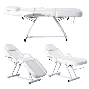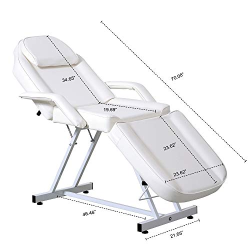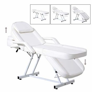 Introductions:Looking for a comfortable bed that not only satisfies your clients but also suits all needs in a beauty salon? Look no further with the 75″ Adjustable Beauty Salon SPA Massage Bed Tattoo Chair! It is a 3-section bed with adjustable backrest and leg rest, which means the bed can lay flat or in a chair-like position. The head cushion can be removed to reveal a facial hole. Thick foam cushion with premium quality upholstery ensures comfort and years of durability. It is just perfect for facials, massages, tattoo sessions and body piercings.Features:1. 3-section bed with adjustable backrest and leg rest2. Lay flat or in a chair-like position3. Removable head cushion, with a facial hole4. Thick foam cushion offers ultimate comfort5. Premium quality upholstery for years of durability6. Ideal for facials, massages, tattoo sessions and body piercingsSpecifications:1. Material: PVC & Iron & Sponge2. Color: White3. Facial Bed Dimensions: (74.8 x 24.02 x 30.71)” / (190 x 61 x 78)cm (L x W x H)4. Facial Bed Dimensions(with Armrest): (74.8 x 33.07 x 30.71)” / (190 x 84 x 78)cm (L x W x H)5. Adjustable Head Height: (29.92-53.15)” / (76-135)cm6. Adjustable Bed-tail Height: (6.69-32.28)” / (17-82)cm7. Headrest Dimensions: (17.72 x 8.27 x 3.94)” / (45 x 21 x 10)cm (L x W x H)8. Weight Capacity: 330lbs / 150kg9. Net Weight: 66.14 lbs / 30kgPackage Includes:1 x Facial Bed1 x Accessories Package1 x User Manual