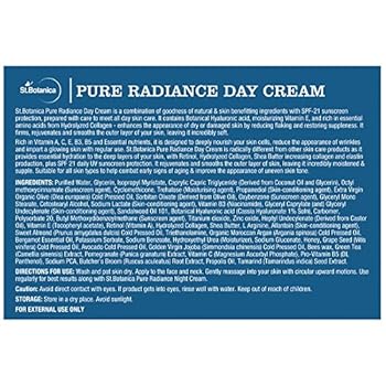 StBotanica Pure Radiance Cream is a luxurious vitamin-rich, day cream to add radiance to the complexion. The cream lends skin vitality and adds a youthful looking radiance to the complexion. The beautifying Vitamins C, A and E and Shea Butter help activate the skin, and provide an energy boost. The cream helps strengthen the skin�s natural defenses and gives the complexion a more youthful and fresher appearance.