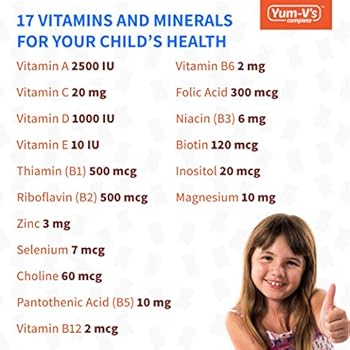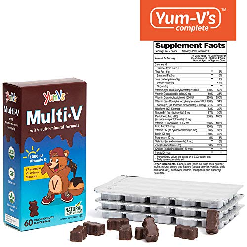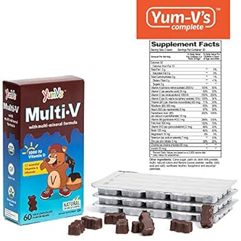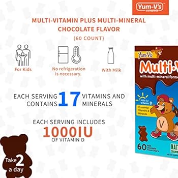 Dietary Supplement: Vitamins and minerals are an essential component in the growth and health of our children. Yum-V’s chocolate flavored bears are an excellent way for kids to get their daily vitamin supplements in an easy and tasty manner. Each serving contains 17 vitamins and minerals including 10001U of Vitamin D, Vitamins B 12, B6, E, C, A and K, Zinc and Magnesium.